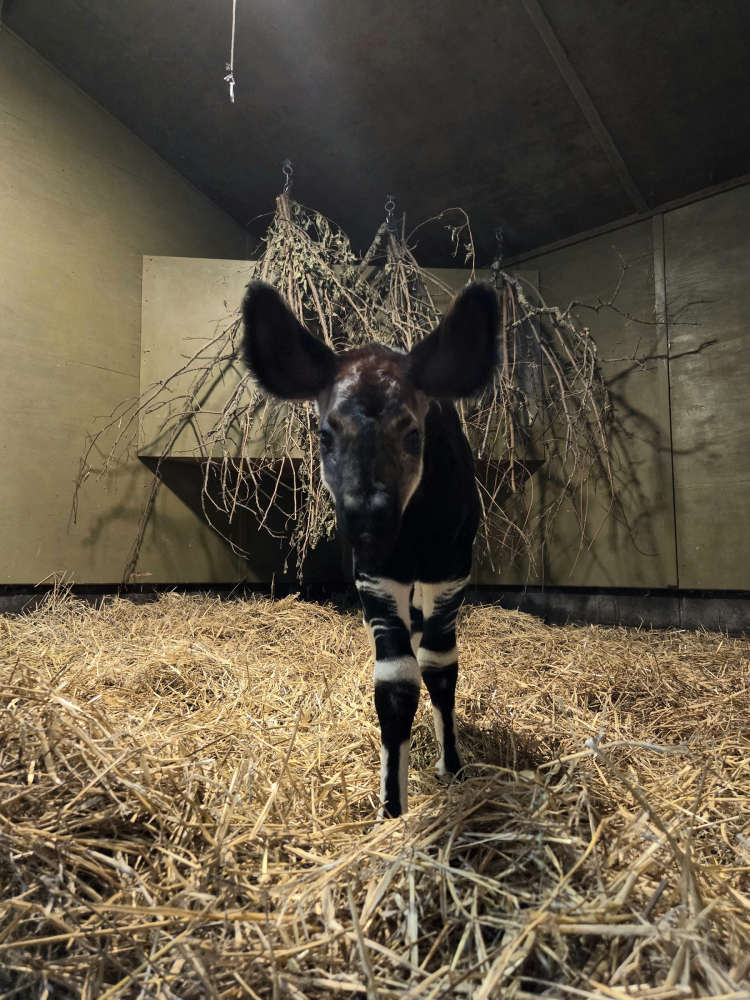 The calf will remain indoors through the colder months, only venturing outdoors when temperatures rise in the spring. Visitors will need to be patient as young okapis often stay hidden and quiet until they gain confidence.
